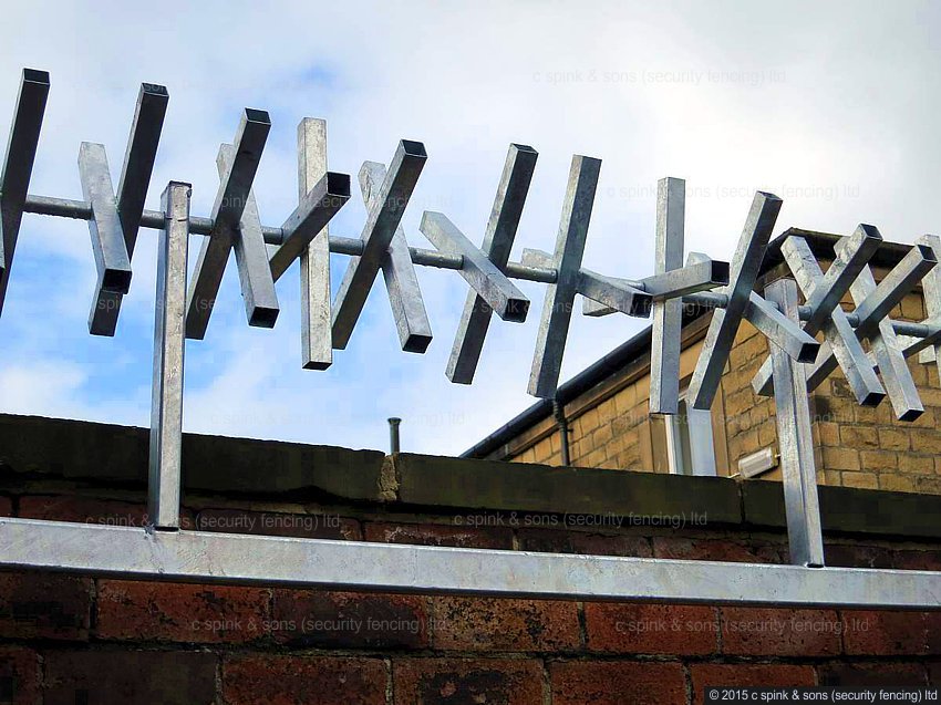 350mm dia. galvanised rotating spikes fixed along the top edge of an existing wall on independent support posts - the company who commissioned the works was not allowed to fix anything directly to the boundary wall